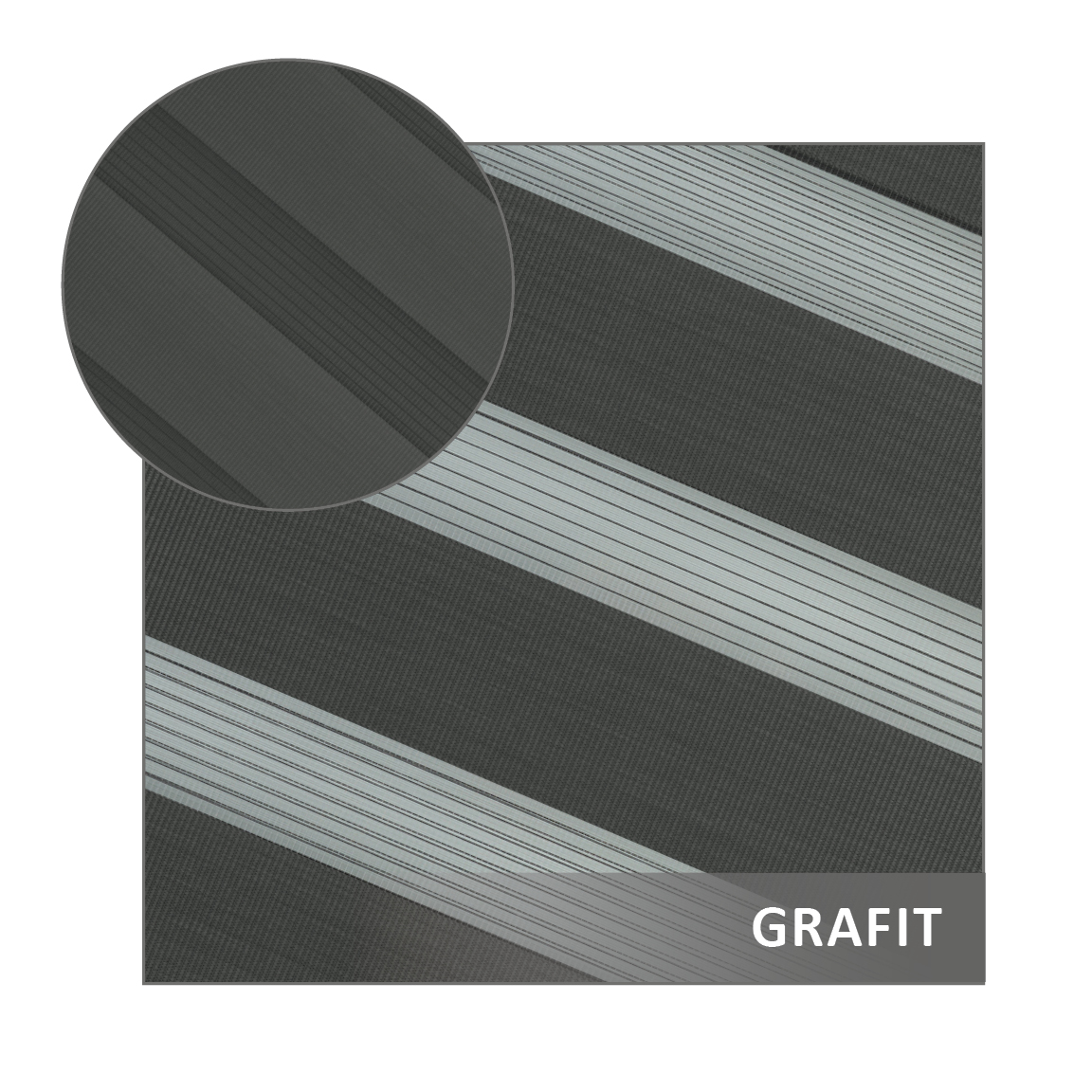Materiał rolety dzień noc składa się z dwóch rodzajów połączonych tkanin w strukturze poziomych pasów: materiału głównego oraz transparentnej siatki.
