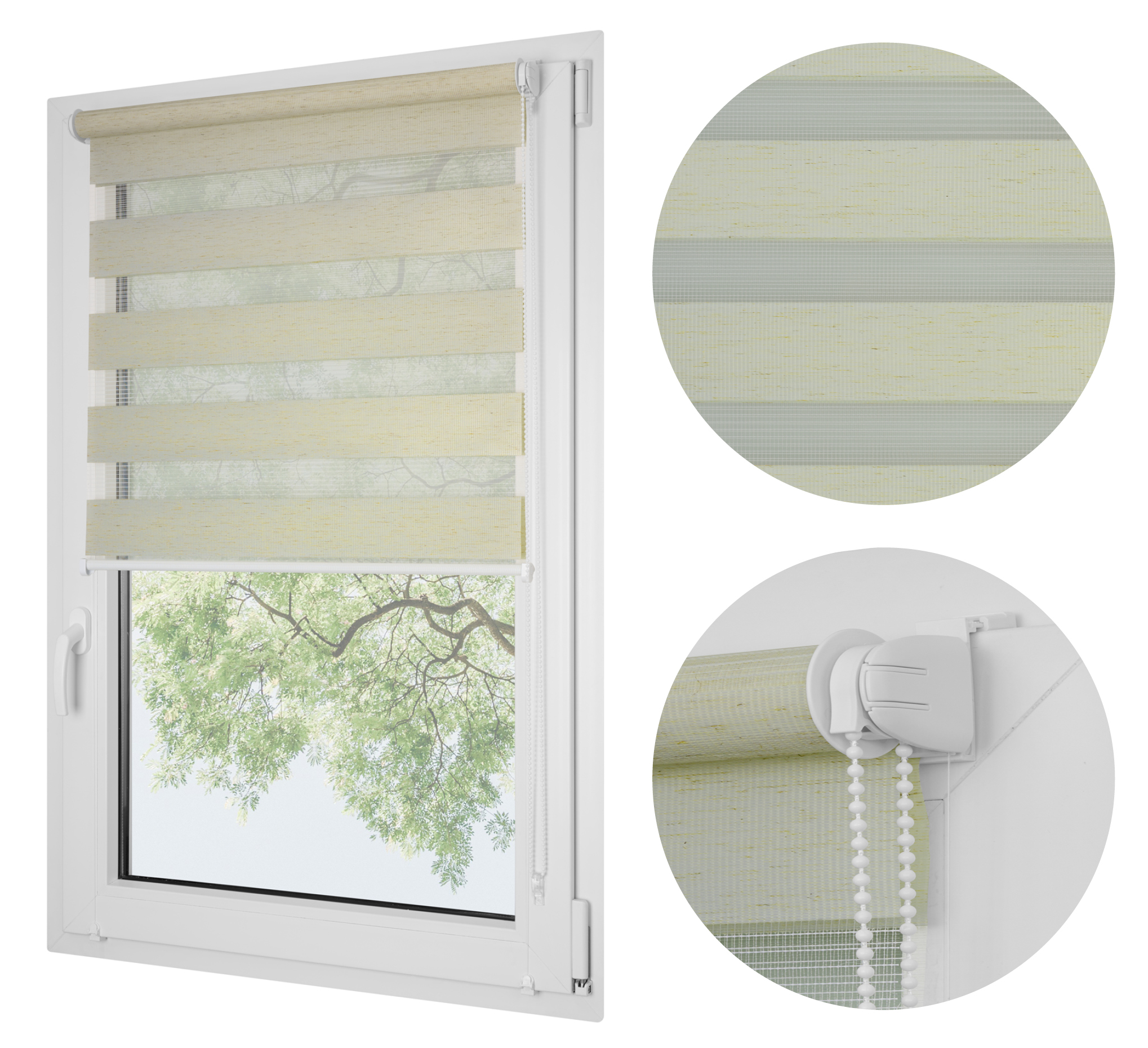 Materiał rolety dzień noc składa się z dwóch rodzajów połączonych tkanin w strukturze poziomych pasów: materiału głównego oraz transparentnej siatki.